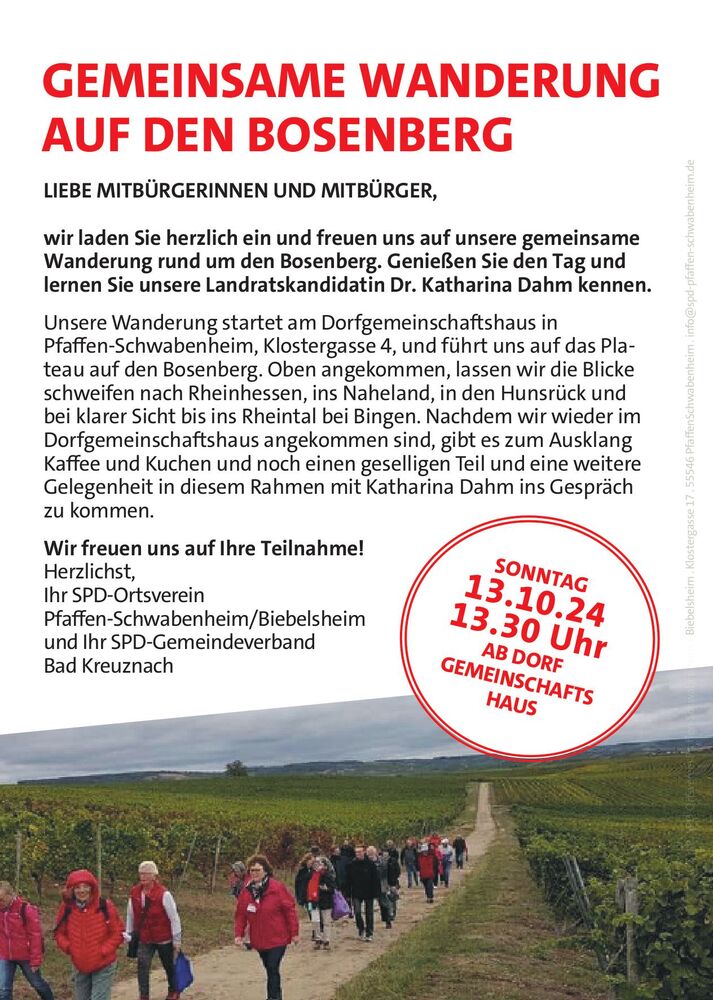 Der SPD-Ortsverein Pfaffen-Schwabenheim und der SPD-Gemeindeverband Bad Kreuznach laden herzlich ein, unsere Landratskandidatin Katharina Dahm kennenzulernen.