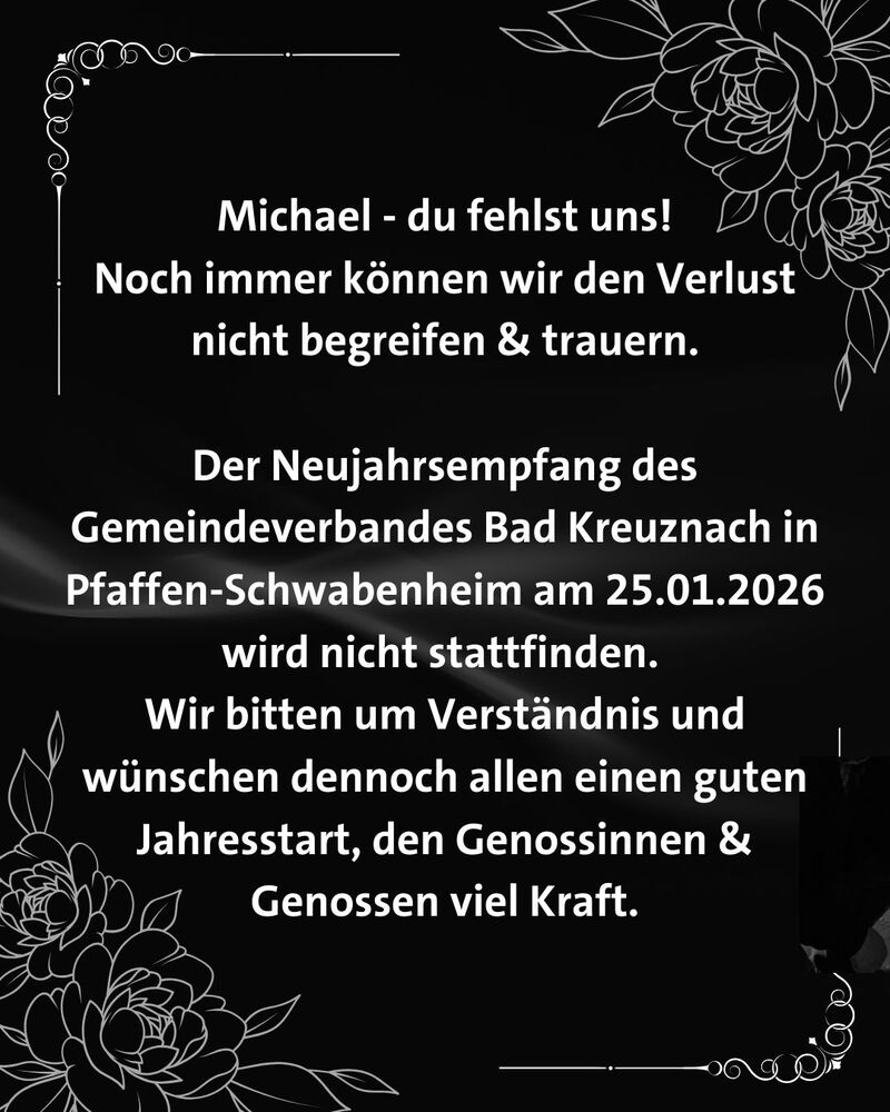 Der am 25. Januar 2026 in Pfaffen-Schwabenheim geplante Neujahrsempfang von SPD-Gemeindeverband Bad Kreuznach und Ortsverein Pfaffen-Schwabenheim findet nach dem plötzlichen Tod von Michael Simon nicht statt.