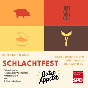 Der SPD- Ortsverein Neu-Bamberg - Tiefenthal lädt herzlich zum traditionellen Schlachtfest ein. Es findet am Samstag, den 22. November 2025 ab 11.00 Uhr in der Georg-Brinken-Stube im Rathaus von Neu-Bamberg statt.